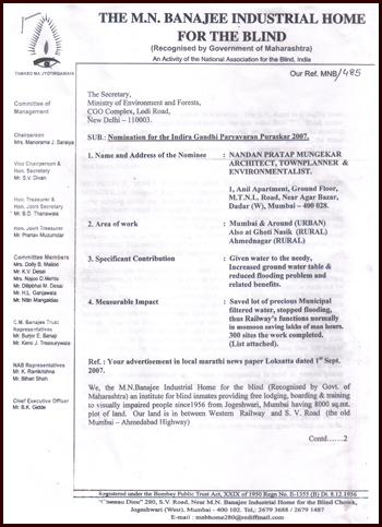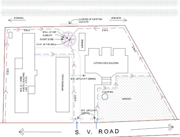 Initially, when site was visited with the intention of Rain Water Harvesting System, it was observed lhat, the entire monsoon water from plot i.e. for terraces of three buildings and open spaces as well as water from S. V. Road was entering in the compound from West side & flowing towards Eastside compound wall and stagnating, creating flooding condition which were dangerous for Blind inmates. They had to travel through 4' to 5' deep water. Hence the rearside compound wall used to punctured to allow the water to flow to western railway line, which use to flood the entire area S stop main artery of Mumbai. However in March -April there use to be shortage of water for blind inmates