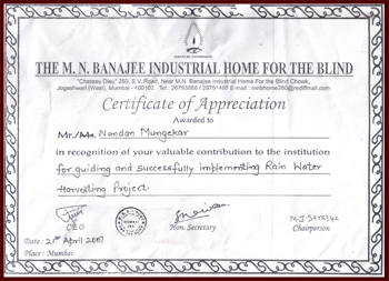 This system increased Ground Water table and also the quality of water and thus the water yielding capacity of the well got increased till the beginning of the next monsoon. Due to increase in ground water table, the pumping cost reduced by Rs. 30,000/- per year which is also a tremendous saving for Blind Home.