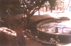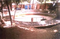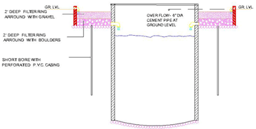Rain water from all sides, as well as from the road was collected into the storm water drain which is all along the internal road and plot boundary. The storm water drain was connected to holding pit around the well with filtration media (i.e. sand, coal, pebbles ) and short bores of 20ft. Deep 8 in numbers around the well. This pit holds the entire day's monsoon water allows the water to percolate into the ground quickly. So there is not much water left on the surface.