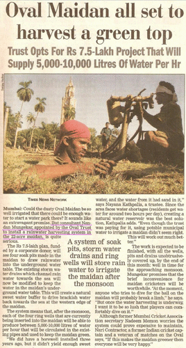 Ever since the restoration was completed in 1999, the Oval trust has been maintaining the ground in every aspect. The Trustees however noted that, the Municipal potable water supply to the ground came only for 2 hours every day and was totally inadequate for the large space in question with its very high usage. In addition in a city facing an acute water shortage it seemed to the Oval Trust to be wasteful to use potable drinking water to green the maidan. This potable water could well be diverted for the city's needs. With this in mind the Trust was looking at various options for harvesting rain water. Therefore when a donor came forward with an offer of doing a Rain Water Harvesting Project in maidan, it made eminent good sense. Trustees put this offer before the State Government for their permission and they readily agreed. After this was approved by the State Government, as the technical experts, we surveyed the whole area and made a report suggesting the best method for Rain Water Harvesting.